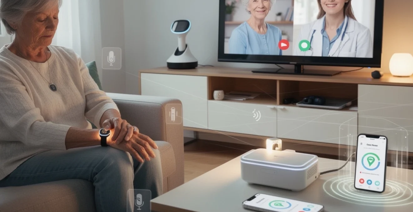 Les robots de téléprésence comme Cutii ou Buddy, ou les robots de compagnie comme Paro (le phoque interactif), représentent une forme plus avancée de présence à distance. Équipés de caméra, de micro et parfois de roues, ces robots peuvent se déplacer dans le logement, initier un appel vidéo avec un proche ou un professionnel, et proposer des activités (gym douce, quiz, musique).